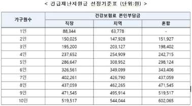 1인 가구 8만8344원, 2인 15만25원 3인 19만5200원, 4인 23만7652원 이하면 지원 대상이 된다고 한다.